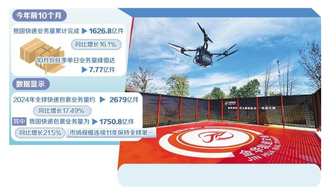 刚刚发布的《全球快递发展报告(2025)》(以下简称《报告》)显示,2024年,全球快递包裹业务量约2679亿件,同比增长17.49%;业务收入约46037亿元,同比增长14.05%。其中,我国快递包裹业务量为1750.8亿件,同比增长21.5%;业务收入为14033.5亿元,同比增长13.8%。我国快递包裹市场规模连续11年保持全球第一,实现月均百亿件跨越式发展,彰显了中国市场的强大韧性和发展潜力。
