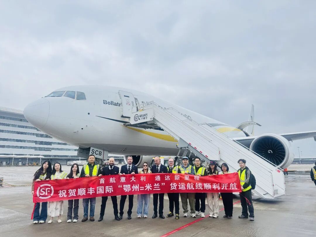 “鄂州=米兰”航线计划每周两班,由B777-200F执飞,业载102吨,以跨境电商普货为核心承载品类。首航去程实现满载;回程支持意大利—中国方向的中小企业试水出海、拓展增量货源。依托鄂州口岸高效的快速通关能力与米兰口岸的快速放行机制,两地口岸作业实现无缝衔接,显著缩短清关与地面处理时间;结合顺丰在欧洲的干线转运与在地派送网络,从揽收、航空、清关到末端配送形成全程可控的端到端物流闭环,将传统的中意跨境时效由一周左右压缩至最快4日达。